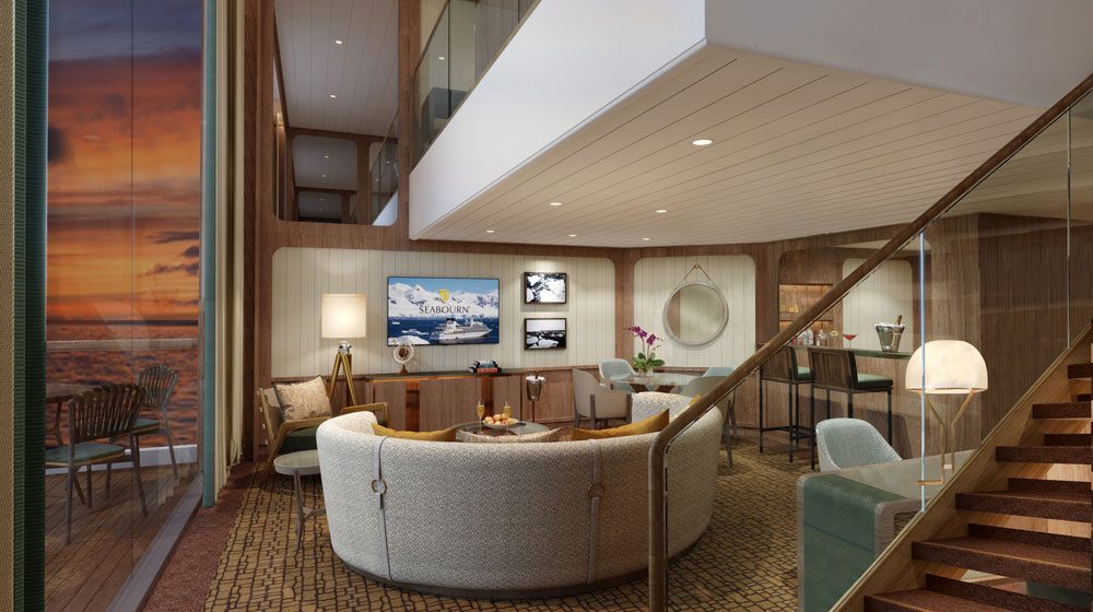 Guests at an event held in Sydney on Friday received a glimpse of the luxury suits to be offered onboard Seabourn’s new expedition ships. Renderings of the Wintergarden, Signature and Owners Suites were revealed, showing Seabourn’s continuing commitment to prestige cruise experiences.Seabourn Venture and its soon-to-be-named sister ship are set to launch in June 2021 and May 2022.The luxury cruise company showed guests what they can expect from its expedition fleet when they released renderings of the public spaces – including the Expedition Lounge, Discovery Center, Landing Zone and Atrium – at the event.The two-story, 130 square-metre Grand Wintergarden suite represents a brand new suite layout for Seabourn. The expansive apartment-style suite stretches over two decks and is located midship. Two suites in this category are available on Seabourn Venture. A generous lower-level living area is large enough for entertaining with a dining table for four, a separate guest bath, and a pantry with wet bar, a second bedroom and a bathroom with separate tub and shower.A sculptured staircase leading to the upper level takes guests to the master bedroom with a queen-sized Duxiana Axion 15 adjustable high-performance sleep system positioned to face expansive windows, allowing guests to soak in the abundant scenery and vistas beyond. Guests will find a separate walk-in closet adjacent to the five-piece bathroom complete with a whirlpool spa tub and separate shower.