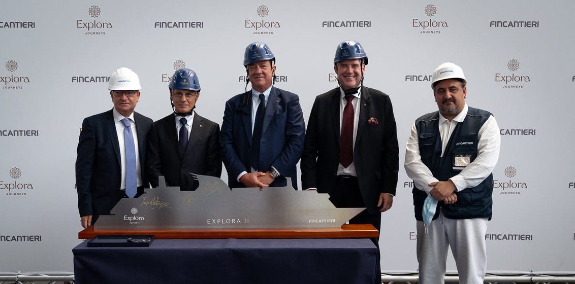All four vessels will be approximately 64,000 gross tons and will feature the latest maritime and environmental technologies and solutions available. Each will be equipped with 461 suites and will showcase a highly-innovative design.Including the four Explora vessels, the partnership between Fincantieri and the cruises division of MSC Group counts eight ships to-date: MSC Seaside and MSC Seaview, delivered in 2017 and 2018, and the two enriched Seaside Evo ships, MSC Seashore (delivered in July 2021), and her sister ship MSC Seascape, which will enter into service next year.Lead image: Pierfrancesco Vago (centre), Executive Chairman of MSC’s cruise divison, flanked by executives of Fincantieri and Explora Journeys at the steel-cutting ceremony for Explora II at Fincantieri’s Setri Ponente yard in Genoa, Italy | Credit: Fincantieri