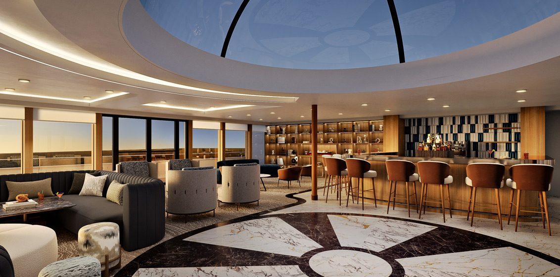 Windstar Cruises is offering a first look at the interior design of Star Seeker’s dining and lounge venues. These first peek images of Amphora Restaurant, Main Lounge, and Yacht Club reveal how inspired design transforms the guest experience aboard this intimate 224-passenger yacht.